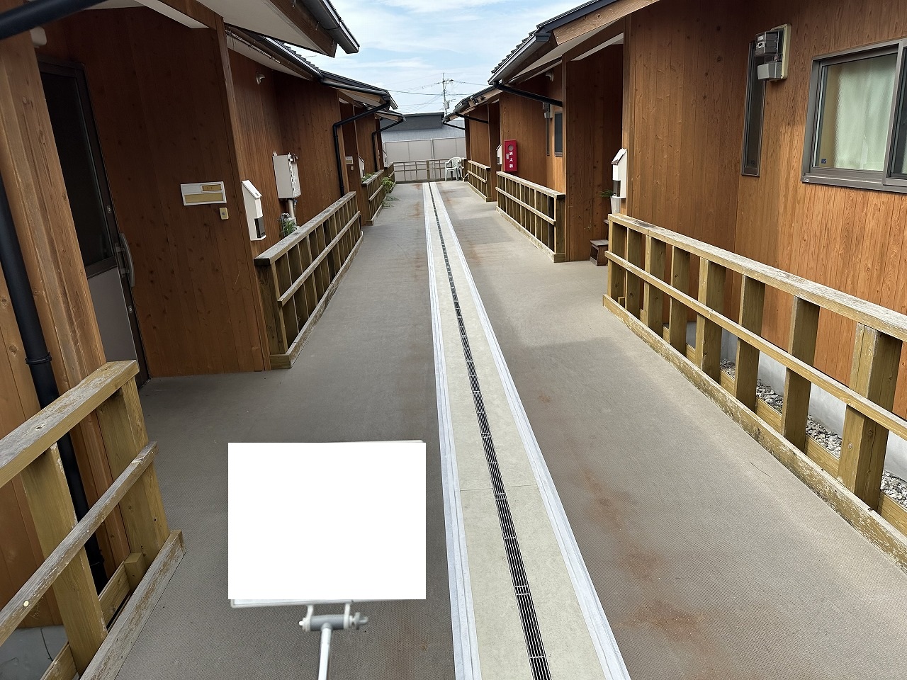 経年劣化の為、玄関前通路が雨水等により腐食していたため樹脂デッキ仕上げ材による改修工事を行いました。