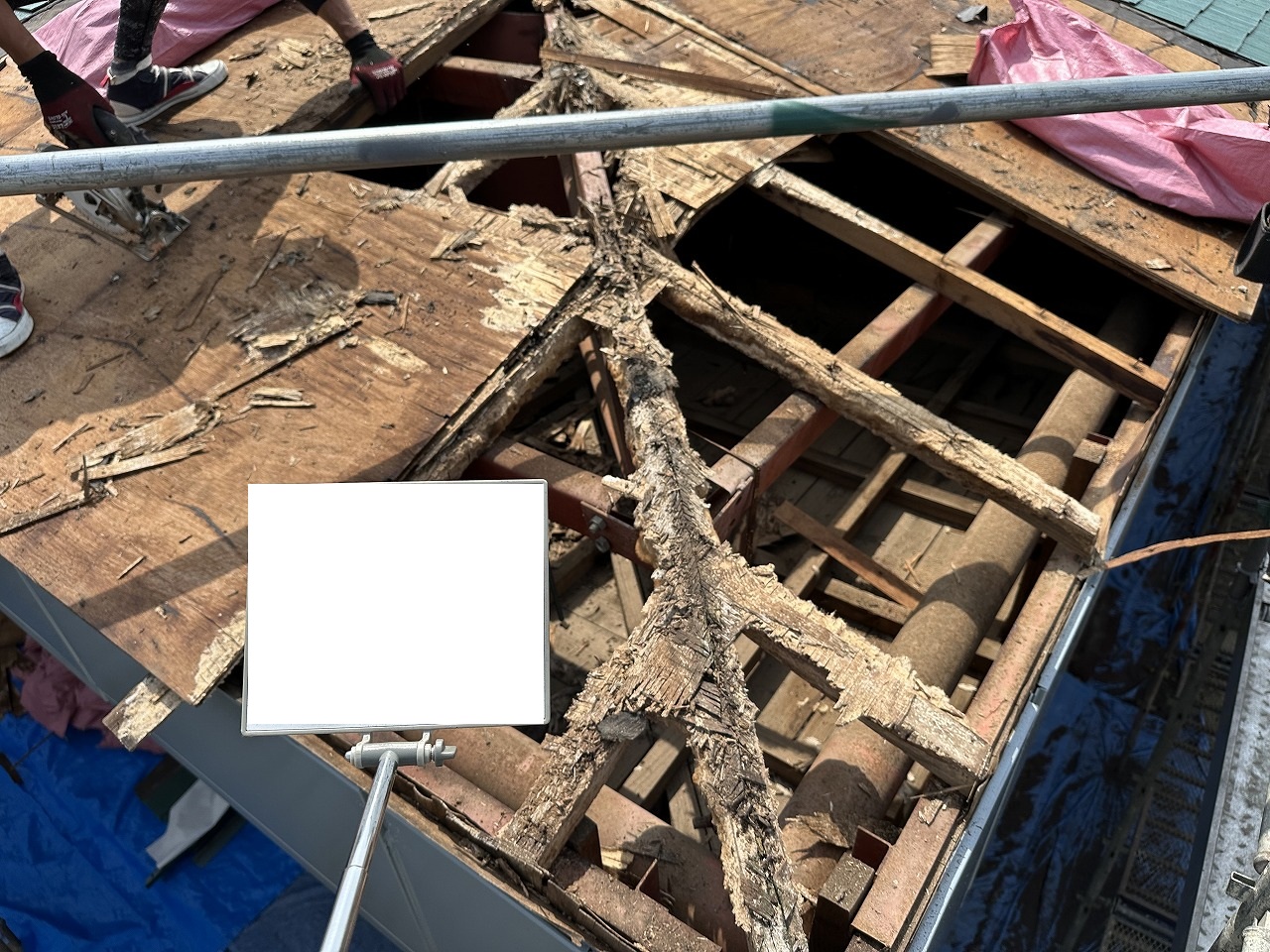 西側屋根等が台風により亀裂破損の為、下地が腐食していました。